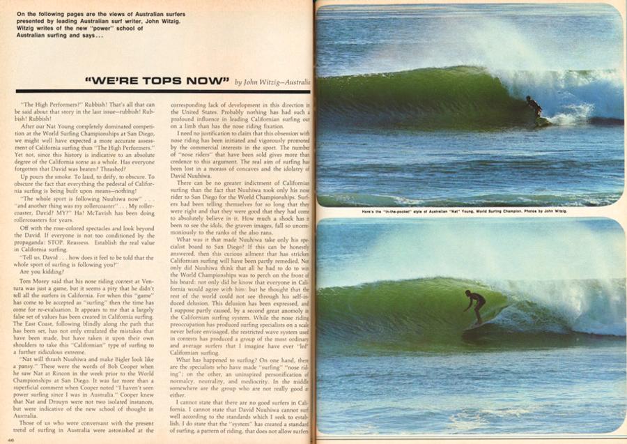 John Witzig's "We're Tops Now" ran in the May 1967 issue of SURFER. It was the magazine's first genuinely notorious article. Witzig was justly angry over the way SURFER and the rest of the American surf press had downplayed Nat Young's win in the 1966 world championships—and it wasn't just Young; Australian surfing in general had not received its due from the Yanks. "We're Tops Now" was Witzig's n...