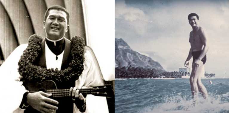 But the man of the hour was the Reverend Abraham Akaka, the head of Honolulu’s historic Kawaiahaʻo Church, friend of Martin Luther King, and a first-rate ukulele player who had a few years earlier been invited, uke included, to lead a service at the White House. A generous and prolific blesser of all things Hawaiian—buildings and events, animals, planes, almost anything—Akaka arrived at the Waimea ceremony by helicopter, touching down on the sand after circling the Bay twice, at which point the vestment-wearing clergyman made his way to a makeshift ti-leaf-covered altar displaying photos of Eddie, addressed the crowd, and in the course of a eulogy delivered in English and Hawaiian, declared that the ocean “is the place where people meet God.”