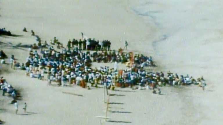 Next up is a montage from Eddie’s memorial service, also at Waimea. The soundtrack is fluid and jarring at the same time, and more than a little eerie, rhythm-free except for a heartbeat-like percussion, and it’s not a long sequence but it will get in your head, and I wish the entire movie was centered on this beautiful, heartbreaking event. Absent that, we’re left with the Honolulu Star-Bulletin’s front-page coverage, which in itself is a remarkable document. Details jump off the page.