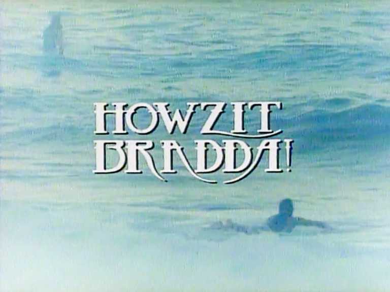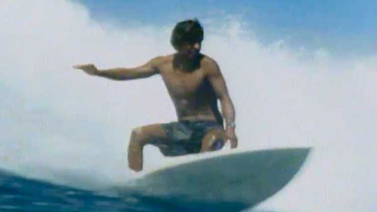 Howzit moves at a languid pace, without narration, and is clearly meant to be an experience rather than anything like a documentary. It’s a stoner movie, basically. But things sharpen up at the end when we see Japanese pro surfer Noboru Sakamoto leap from a helicopter into the ocean. A caption at the bottom of the screen reads, “19, Feb. Waimea Bay (16–18 feet).” We then see Noboru sitting next to Eddie Aikau, who seems to give the Japanese surfer instructions on where to sit and how to line up. The next two minutes is almost all Eddie, same session, riding bumpy smallish Waimea waves with Noboru off to the side taking notes—nothing of real interest here, surf-wise, just a half-dozen waves, all shown in regular motion, and on the last one Eddie hits the deck and prones for shore. Then a crossfade to a birds-eye view of the Holuke‘a voyaging canoe, with the caption reading “25, Feb. Waikiki,” and if you have even a passing knowledge of Aikau’s history you get an uneasy feeling, and for good reason, because what you’re seeing here is Eddie on a shakedown cruise, less than a month before sailing off to his death. I don’t know for sure, but I’d guess that go-out with Noboru was Eddie’s last-ever surf at Waimea.