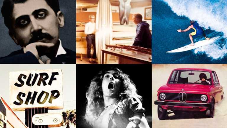 [Photo grid, clockwise from top left: Marcel Proust, 1960s surf shop, Nick Carroll surf shot by Jeff Divine, BMW 2002 model with cocaine in glove compartment, Robert Plant, unknown surf shop sign. 1982 surf shop photo by Matt Warshaw. Penthouse Forum magazine cover. Gold Coast surf shop by Martin Tullemans. Hobie shop in Dana Point. Velzy shop in Manhattan Beach taken by Don Guild]