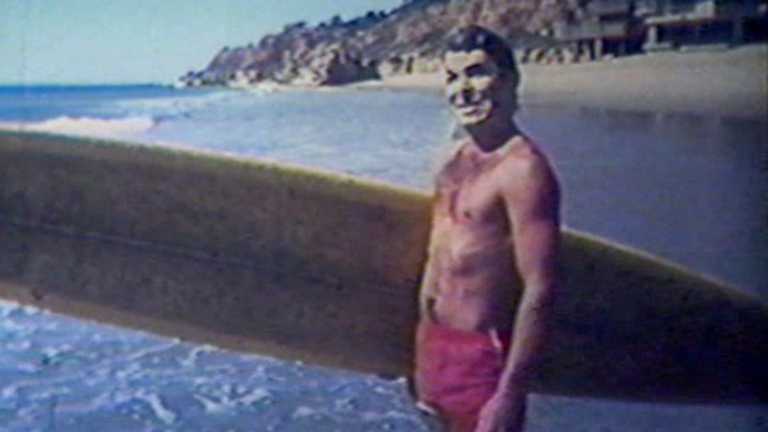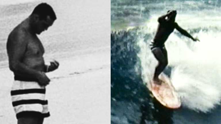 But there is a limit. And Noll taking credit for inventing his famous black-and-white jailhouse jams is where I rap my knuckles sharply against my Louis XV inlaid rosewood writing bureau and say “Enough!” I’m halfway through a massive upload of every Makaha International contest ever held, and while looking at footage from 1957 I paused in wonder at the fine Makaha stylings of Conrad Canha—and speaking of flair, good heavens, this little pot-bellied homunculus was brimming with the stuff, all the way down to his trunks, which feature wide horizontal black-and-white stripes and goddammit, Greg Noll, you stole those things right off Conrad’s furry thighs! For some perspective, we turn to William Katt, who wrote: “He who filches my baggies robs me of that which not enriches him, and makes me poor indeed.” Except Noll made a bundle flogging those striped trunks by way of Hang Ten. The hustle never ends.