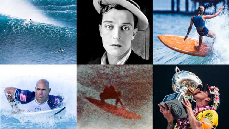 [Photo grid, from top left: Pipeline by Sean Davey, Buster Keaton, Margo Oberg by Jeff Divine, Gabe Medina, Joey Cabell, Kelly Slater. Slater’s Backdoor tube by WSL. Medina by Kelly Cestari.]