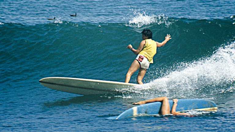 After searching the near and far reaches of surf moviedom from the early- and mid-’60s I have come up with just 43 total seconds showing Joey Hamasaki, the She-Buddha of flow, actually up and riding. Forty-three seconds. Six waves. That’s it. But you don’t need much gold to shine, and I believe this clip makes up in soul and mood for what it lacks in length. Size matters—but not always. Hell, the entire Get Happy LP is shorter than this video. Not quite, but you take my point.