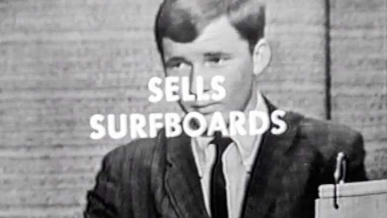 Here’s a 1966 clip from the popular What’s My Line game show, featuring “Balsa Bill” Yerkes back when he was but a stripling of 19. Old-timers, bear with me while I explain Line to the youngsters: a guest with a slightly unusual occupation was introduced—“Sells Surfboards,” in Yerkes case; he was a shop-jockey at Keller Surf Shop in Lavallette, New Jersey. The in-studio audience and TV viewers are told the occupation, while the four celebrity panelists are not, and the game consists of the celebs taking turns trying to guess the job. This was a tame concept even for the period (Candid Camera had way more zing), but it’s fun watching the panelists cogitate their way (or not) to the right answer.