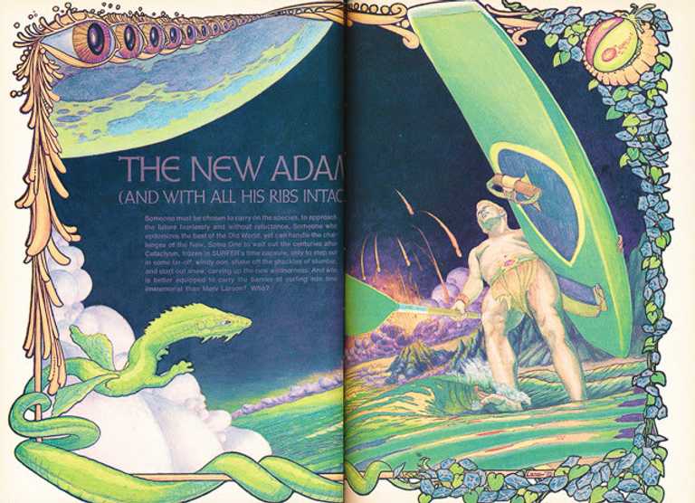 Finally, I've been meaning to post Drew Kampion's 1970 SURFER profile on wave-ski maestro Merv Larson for years, and have finally done so. Just a little background, so as to explain the accompanying art you see above. The Larson article is titled "The New Adam," because it is part of a concept issue, explained in the magazine's deadpan cover blurb, "First Annual End of the World Issue," which all by itself shoots down my theory that American surfing was not funny until Mike Purpus and Angie Reno got into a Playgirl-related sausage fight. Anyway, as Drew viewed it, Merv was destined to be the sole survivor from a planet-drowning tidal wave—"You brought this on yourself, readers, by throwing all those things out of your car windows"—and would thus preserve and deliver surfing to the new age. So that's what's going on, above, with the art. I think. Actually, I'm just looking for a reason to get you to watch this short clip of Larson in action, which I still maintain proves Larson to be either the single most ahead-of-his-time wave-rider of all time or, if you insist, locked a dead heat with George Greenough and Mike Stewart.