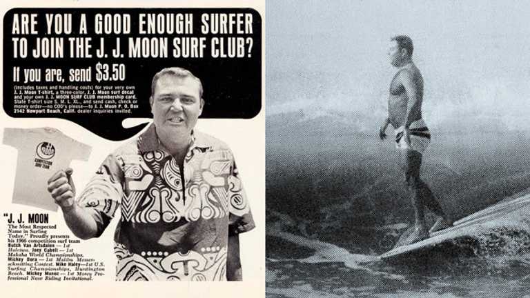 The funniest surfer in 1966, or at least the most famous funny surfer, was JJ Moon, self-proclaimed "World's Greatest" rider of waves, with his furry papa-bear belly and resting Alfred E. Neuman face, who took a well-executed alter-ego joke all the way to a full-length Life magazine profile. The opening part of the JJ Moon story—the prank that begat the prank—is the best. Moon was actually Ned Eckert, an assistant basketball coach at Chapman University who also happened to be friends with some of the best American surfers of the day, including Corky Carroll and Miki Dora. He'd been using the "JJ Moon" handle to write his "Moonshots" horse racing column for the Newport Beach Daily Pilot, and in late 1964, as a gag and unbeknownst to Eckert, JJ Moon was entered into the Makaha International Surfing Championships. Eckert found out when he landed in Honolulu on a winter surf vacation and saw his name in the papers as a Makaha contestant.