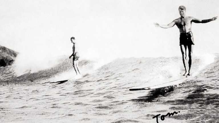 Sam threw a couple of head fakes, first replying to his own question with an emphatic “Oh yeah,” then hedging his bet with “tough call” and a stated belief that surfing’s hipness “screeches to a halt in the early ’60s,” then closing the discussion with a time-traveling upvote: “Surfing was hip, is hip, and always will be hip.” Tom Blake, according to Sam, figures heavily into all of this.