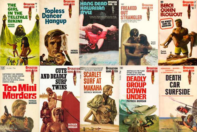 I’ll tell you who knows a thing or two about man-eating sharks, violent death, drug vials, swift reversals of fortune, and all manner of political and biological international intrigue, and that is Bill Cartwright—millionaire playboy surfer-spy, and star of the ten-book Operation Hang Ten detective series. Pause a moment to run your peepers across those book covers. Now take a belt of this hardboiled 100-proof Operation Hang Ten prose: