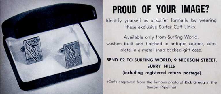 A few weeks ago I was idly paging through a 1964 issue of Surfing World, looking for pix of Dorothy de Rooy, and I came across an ad for “exclusive Surfer Cuff Links.” Given that surfers at that time were still grouped with bikers and beatniks and other societal gray-zoners, the ad’s all-caps header—“PROUD OF YOUR IMAGE?”—can be read in two ways:
