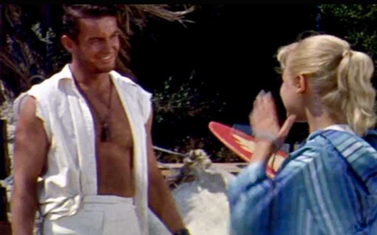 If I’m a landlocked movie-loving teen in 1959, in other words, watching Gidget at the local Bijou in Madison or Topeka or St. Paul, I’m no doubt wowed by the surfing itself—but tractor-beamed by how these tanned California kids look and talk and move; how that one guy sits on the sand wearing nothing but a towel and a grin, and the other guy pops out of his beach shack in an unbuttoned ripped-at-the-shoulders dress shirt that is straight-up mocking the pressed and tucked-in shirt worn by Gidget’s dad in the previous scene.
