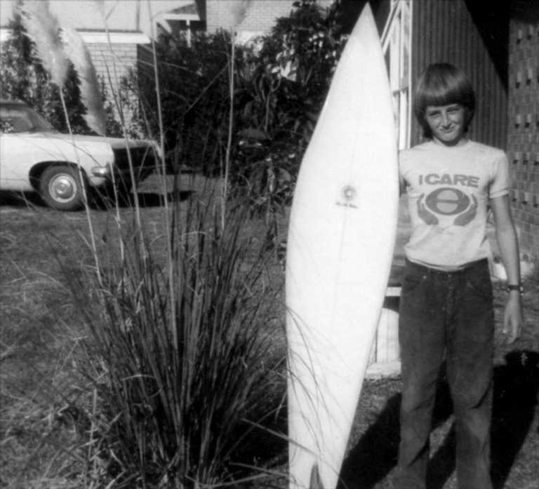 This is taken in front of the family home at Wanda, Cronulla, and I’m displaying my first homemade board. The blank and materials cost me $33, that was a lot of money considering the milko [milk delivery] I helped do mornings paid me $1.25 for three hours work. The board was 5'10" and 13" wide. My brother read somewhere that the width of a board should be the measurement between your nipples plus 2 inches. We had seen magazine shots of Terry Fitz riding something similar at Sunset Beach in Hawaii and we thought the spear shape would work at a Wanda beach break. I persisted in trying to ride it for ages but couldn’t turn the thing. I later sold to to Max Garlings’ Surf Shop in Cronulla. He had the board on display amongst all the bikinis.