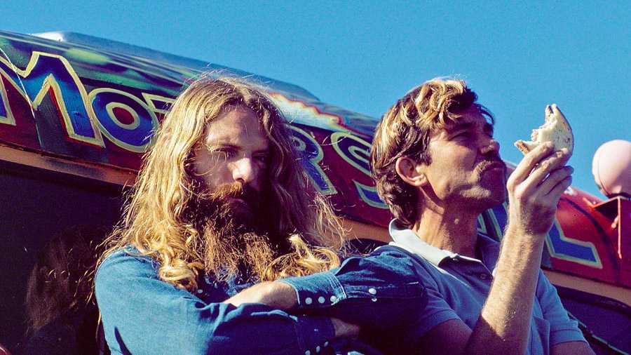 Finally, and dazzlingly, have a look at this short but pungently sweet Art Brewer gallery showing the transformation of a funky old dull-green bus into—Motorskill. The Brewer pic you see below, of Griffin and Severson during lunchbreak, made my week. And broke my heart, as both are no longer with us.