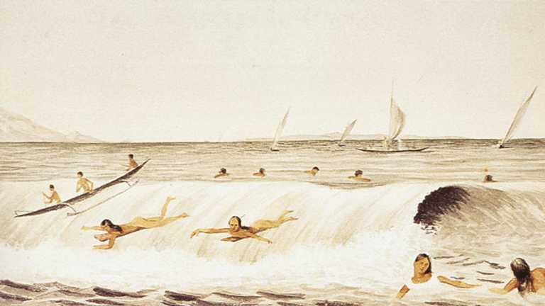 What comes through in these musty but still-living lines of prose, and why I hold them so dear, is not just how exciting the sport is to people who are seeing it for the first time (the “amazing rapidity” and “incredible swiftness” of the ride), but how wholly unexpected it is. Consider the sailor’s POV. His seafaring career is literally and with infinite caution spent steering clear of breaking waves. And yet this is where he finds the locals at play. It would have been more amazing had the Hawaiians jumped off a cliff and taken flight, but not by much. In fact, as one sailor wrote, the surfing natives “seem to fly on the water.”