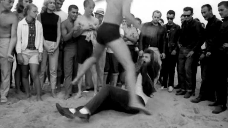 There is no actual surfing in Party Beach, however, so let’s move on to Beach Girls and the Monster, which is at once more familiar (shot in LA, with some excellent if gratuitous surfing footage of Miki Dora and Mike Doyle), but also deeply confused about itself. The crime-solving part is 100% Scooby-Doo. The bikini hijinks are Beach Blanket Bingo minus the Panavision Color, which is a kick in the nuts. You can maybe kinda see these two things working together, the Frugging and the murder-solving. But hold on, here comes the gin-scented trophy wife, weaving down the hall, tumbler in hand, kicking her stilettos off before entering her stepson’s bedroom door—now we’re in Mrs. Robinson territory. Then cut to our handsome young star’s best friend, who is meant to be gay and compelling, like Sal Mineo from Rebel Without a Cause, but is instead gay and annoying, although you feel bad because it is 1965 and he is obviously gay and can’t come out. Even the soundtrack is bipolar, with throbbing surf instrumentals provided by the Hustlers rubbing up against some equally good jazz numbers, and this crazy pre-Muppet singalong thrown in for good measure.