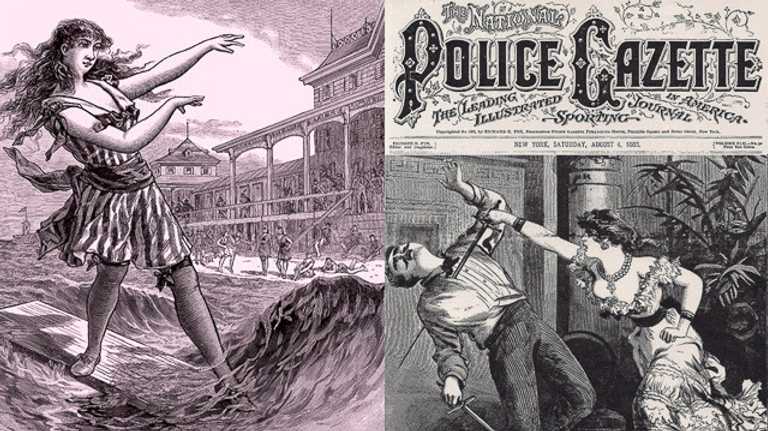 The surfboard-riding Police Gazette cover girl for August 18, 1888, was identified as the "Gay Queen of the Waves," and while the image you see above has been floating around the surf history back channels for the past 15 years, it took another decade to connect the wild-haired bare-armed woman to the ocean-going New Jersey "goddess" as described two weeks earlier in a Pittsburgh Press column titled "Sounds from the Sea." An excerpt: