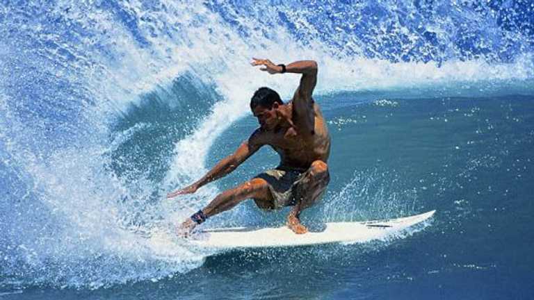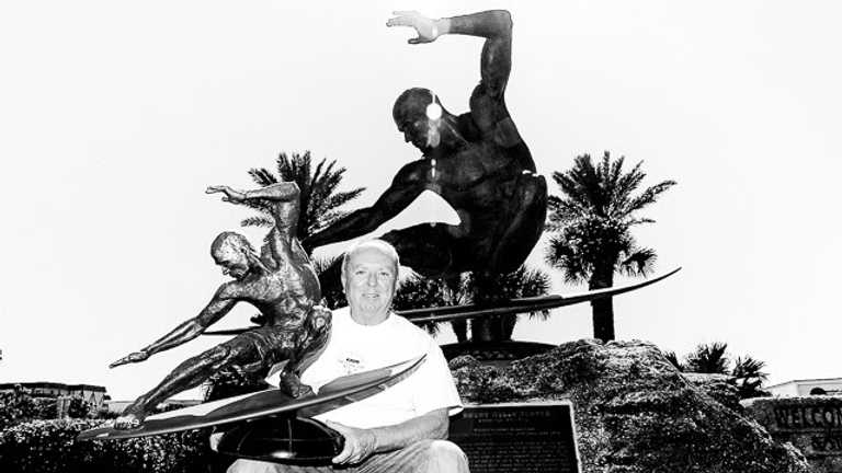 Except for Jesus and Elvis, every famous person's life eventually gets reduced down and poured into the smallest possible container, and while Florida-based surf photographer Tom Dugan worked miracles at Sebastian Inlet, he will not be mistaken for the Redeemer—redheads never are—and thus I believe Dugan's contribution will in time rest on just two images. Which is more than most of us will get. First, his 1998 photo of Kelly Slater, midway through some kind of ninja throwing-star cutback, never one of my favorite shots (I like my rails the way I like my grudges; buried deep), but just the thing if you're the Cocoa Beach City Council and looking for something upon which to model a highway-adjacent statue of your town's favorite son. The massive Kelly Slater bronze was unveiled in 2010, and below you see Tom happily sitting by the A1A, big statue to the rear, small version on his knee. Two hundred years from now—or maybe 20 years, shit's going bad faster than we thought—deep-sea divers will find the Slater statue lording over the watery remains of Cocoa Beach, and I hope Dugan carved his initials somewhere on the bottom of Kelly's board so as to throw some much-deserved credit his way.