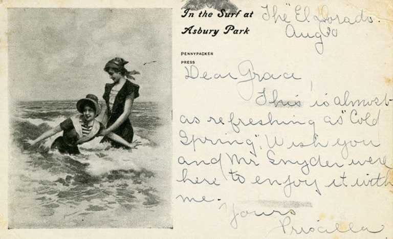A group of summer loungers on the beach at Asbury Park were watching the antics of a dark-eyed, bronze-faced girl in the sea this morning. [She] was beyond the line of breakers and standing on a plank that rose and fell with the swelling waves. Her bathing dress was of some dark material, fitting close to the figure, the skirts reaching scarce to the knee, her stockings were of amber hue, adorned with what from the shore seemed to be vines and roses in colored embroidery. She wore no hat or cap. Her tunic was quite sleeveless, and one could scarcely fail to observe the perfect development and grace of her arms.
