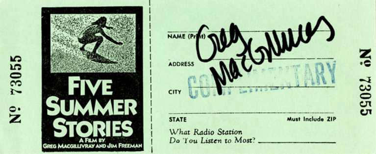 Eve went to the premiere of Five Summer Stories, at the Santa Monica Civic, and you can read her Rolling Stone review here. It is very good. Babitz describes Gerry Lopez as looking like “a relaxed lady-killer revolutionary,” and says FSS producer Greg MacGillivray comes off not as a surfer or filmmaker but “a young high school algebra teacher.” But her best lines are given, deservedly, to David Nuuhiwa.