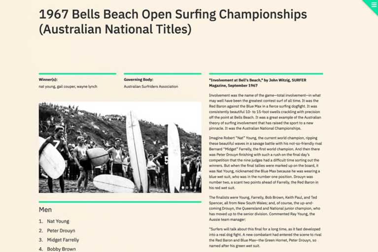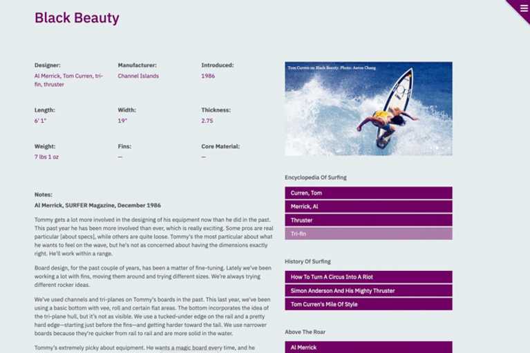 What’s on our to-do list for 2020? Apart from creating and improving the pages you already know (Encyclopedia of Surfing, History of Surfing, Above the Roar), we’ve just added beta versions for two new EOS areas: Surfboards and Contests. Click here to see a Surfboard page, and here for a Contest page. Both environments are already functional and integrated with the rest of the site, but they need hundreds of pages to really lift off—which means added work hours, which means staffing up.