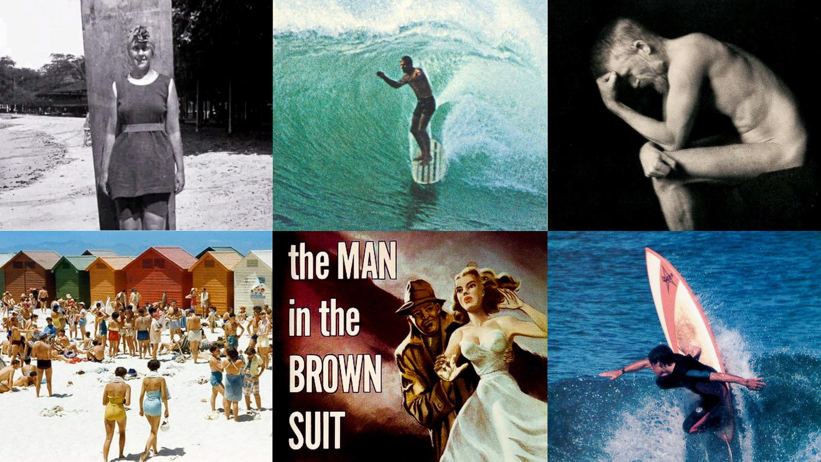 [Photo grid, clockwise from top left: Agatha Christie in Waikiki, 1922; Tony van den Heuvel, Durban, 1965, photo by Ron Perrott; George Bernard Shaw posing as "The Thinker" in 1906, photo by Alvin Coburn; Tom Carroll at Burleigh, early 1980s; detail from Christie's The Man in the Brown Suit book cover; changing huts at Muizenberg in the 1950s. GB Shaw at Muizenberg in 1932. Agatha and Archie Christie in Waikiki. Christie portrait from the early '20s. Van den Heuvel surfing Durban in 1965, photo by Andrew Ogilvie. Portrait of van den Heuvel by Olgilvie. Van den Heuvel at Jeffreys in the early 2000s, photo by Lance Slabbert. Tom Carroll at Jeffreys, 1984, photo by Pat Flanagan. Carroll and Shaun Tomson by Flanagan. Carroll with boards in his backyard, by Jack McCoy]
