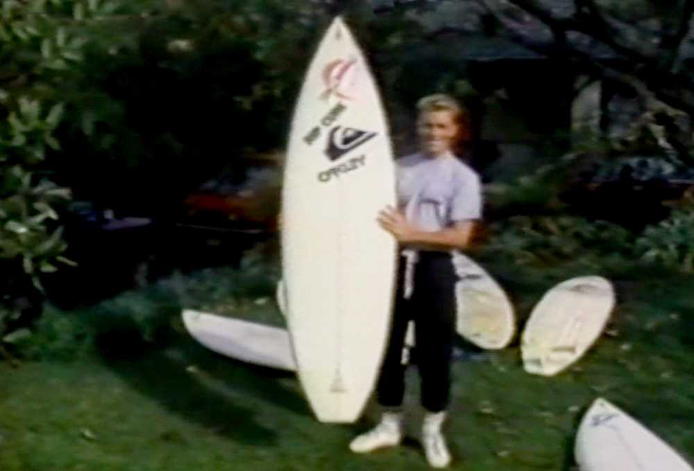 My favorite part is at the beginning, when Tom weaves his bike to and fro down a High Street sidewalk, tucks into a tree-branch tube, then scores a free apple off the fruit-stand girl without even stopping. Also great is the bit with Tom in the backyard showing off his quiver, talking dimensions and rocker and whatnot, I can't remember, my eyes were glued to Tom's sweatpants because the waistband is cinched up around his navel while the legs are tucked unironically in his socks. The defining power surfer of his generation, maybe any generation, looks like he should be miniaturized and attached to the zipper of a Disney Princess backpack.