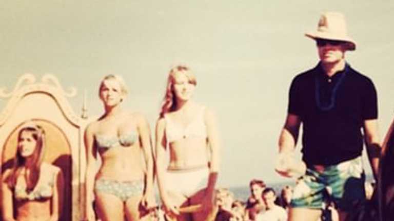 John Hannon will always be the Father of New York Surfing but Charlie Bunger, I believe, is the Daddy. Glad to welcome both men to Encyclopedia of Surfing. That’s Hannon, above, looking a bit villainous himself at a ’66 Gilgo Beach trophy presentation—which only goes to show that a tight black shirt, shades, and a well-angled hat can make anyone look wicked. Hannon was far from wicked. In fact, as I understand it, he was good unto saintliness. Had a fine sense of humor, too—read his Roar interview here.