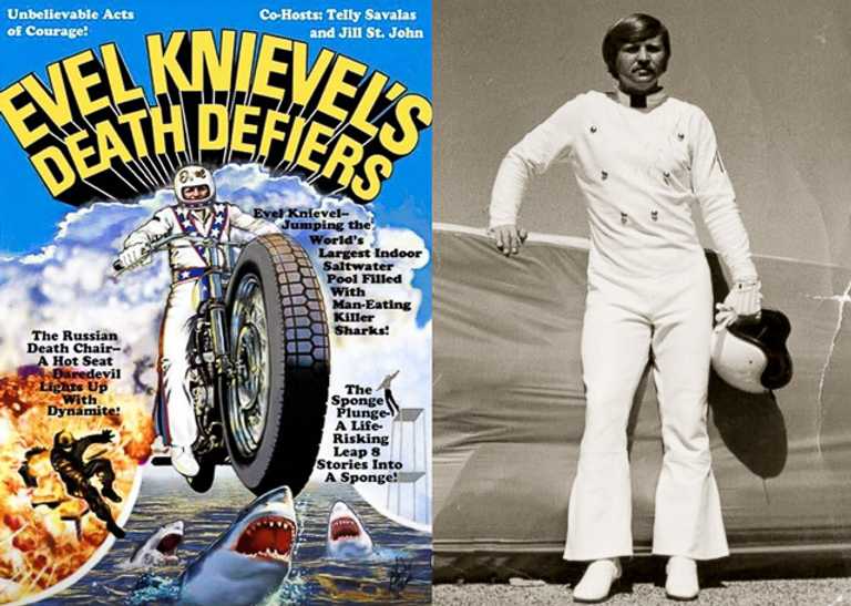 PPPS: Was just about to hit “send” on this one, but Joe Gerlach keeps giving. In 1977 he was a featured daredevil on “Evel Knievel’s Death Defiers” CBS special, in which Knievel was set to jump a pool filled with “13 man-eating sharks.” Other acts included Karl Wallenda tight-rope walking 750′ between two hotels (watch here, with commentary by Telly Savalas who, at one point, seemingly bored with Wallenda’s slow pace, growls “Let’s go, Karl”), and something called the Russian Death Chair. Two hours before show time, Knievel did a final practice run, crashed, broke his right arm and had to cancel his performance. This was not long after Knievel’s Snake River debacle and right before he landed in prison for beating his former press agent with a bat, and that was pretty much it for Evel’s career. Joe Gerlach himself did fine, landing his jump cleanly, but the “Death Defiers” show itself was, according to the Washington Post, “the most ill-conceived, tasteless and poorly executed network special in history.”