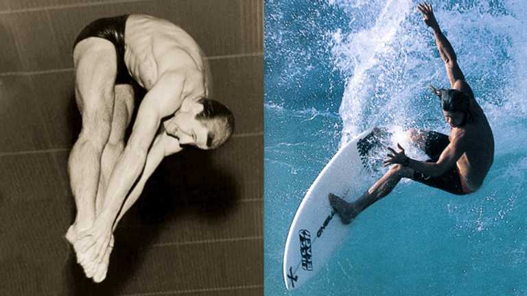 [Photo grid, clockwise from top left: Jumpin’ Joe Gerlach; Brad Gerlach, photo by Sonny Miller; Top Cat; Evel Knievel; Brad portrait by Pete Taras; Tom Curren framegrab from Amazing Surf Stories. Gerlach surf pic by Martin Tullemans. Stubbies 1985 pic by Robert Beck. Gerlach cutback by Art Brewer. Brad’s Wave Ki practice. Joe hits the Sponge. Brad’s 2005 XXL Big Wave Award winner. Joe Gerlach diving in 1960 for University of Michigan. Brad Gerlach surf photo by Brian Bielmann. “Death Defiers” poster. Joe Gerlach in jumping gear.]