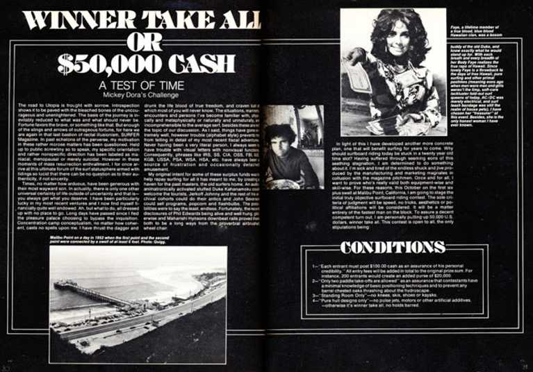 Speaking of Malibu and questionable ways to make use of perfect waves, here is a full reprint of SURFER Magazine's 1974 cover story "Winner Take All: as $50,000 Cash—Mickey Dora's Challenge," which at the time even my unformed 13-year-old mind registered as being something between hoax and satire, although some people apparently took it seriously (I'm looking at you, Mike Purpus). On the face of it, Dora's idea was to have surfers race from the top of the point to the bottom, each wave timed, fastest guy wins 50 large. The big day came and of course Dora didn't show, and surprise! the whole thing was an elaborate prank on the idea of professional surfing. As a bit, it's twice as long as it should be, but worth a read nonetheless. (Dora's 1969 "Cataclysm" graph, which is as sharply-pointed as it nonsensical, is a good companion piece to the $50,000 Challenge.)