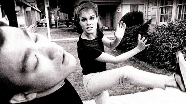 PS: We're talking about the military here because somebody tagged me on an Instagram post featuring actress-model Wende Wagner surrounded by an exquisite Candyland display of 1965 Con surfboards. I’d never heard of Wagner (or the photographer, Orlando Suero; quite the portfolio on that guy), but soon learned that she was the daughter of a Navy commander, went to high school in San Diego, and played Lenore Case, secretary to undercover superhero Britt Reid in the one-season-and-done 1966 Green Hornet TV series. That’s her, below, putting shoe leather to the jaw of Bruce Lee, who played Kato, Reid’s chauffeur, on the show. Wagner later was married to Ride the Wild Surf bully James Mitchum, roomed with Sharon Tate and, as a high school friend later recalled, “lived in an awfully fast lane.” She died in 1997, at age 55.