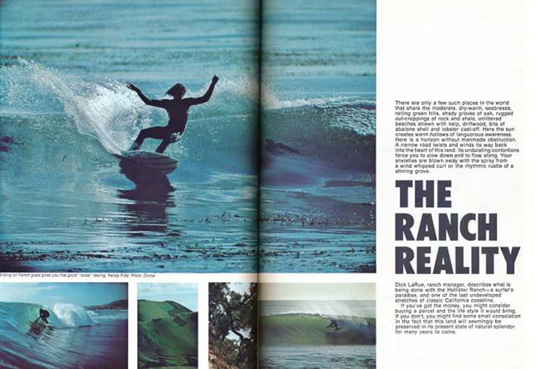 In 1972, not long after Ranch ownership was transferred to a Wisconsin-based development company who in turn divided the property into 135 100-acre parcels, the sales and marketing job was given to a former Texas cattleman named Dick LaRue, who took the title of “Ranch Manager.” (Pictured above, with Ronald and Nancy Reagan.) It is unclear whether LaRue reached out to SURFER or the other way around, but that same year a magazine-organized series of Ranch trips was dispatched. Jeff Divine and Brad Barrett got the photos, LaRue himself wrote the copy, and the resulting 12-page feature, “The Ranch Reality,” was published in the July 1972 issue. Visually, of course, it is a triumph. Undeveloped hills and valleys, perfect surf, empty lineups. But LaRue’s article is something else entirely—a sales pitch wearing a Gestapo jacket pretending to be a conservation statement.
