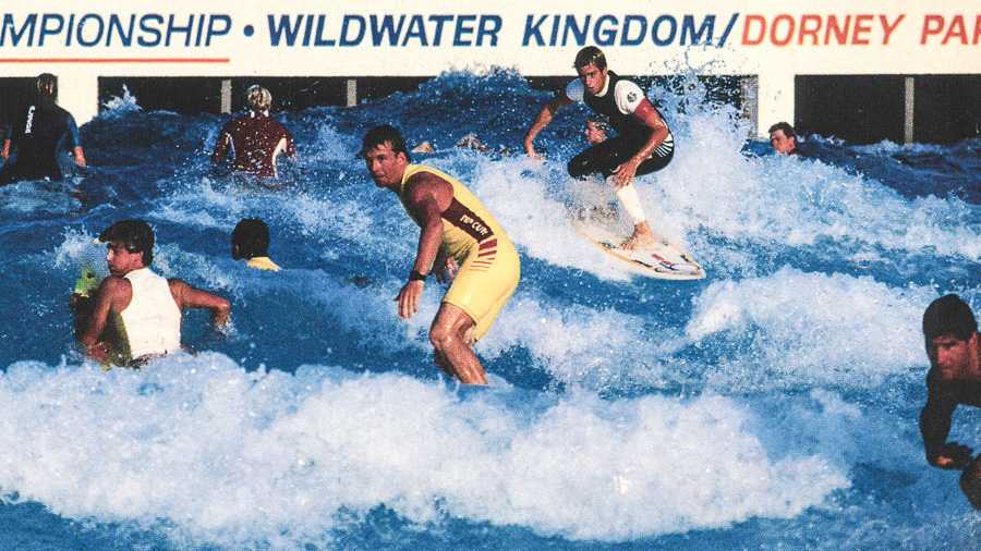 “Surf in a Box,” the second-to-last History of Surfing chapter, went up on Tuesday. This is the wavepool section, and I’ve been very much not looking forward to this one, because a) it needed a lot of work, and b) like you guys, by this point I’m a little sick of talking about wavepools. Had to be done, though. Now remember, this section was drafted over ten years ago, before the wavepool deal achieved any kind of real liftoff. The 2006 pic you see below, of the Ron Jon SurfPark prototype in Orlando, Florida, ran as a two-page spread in the book version of History of Surfing and was meant to serve as a snarky-but-not-totally-false summation of the wavepool movement that time.