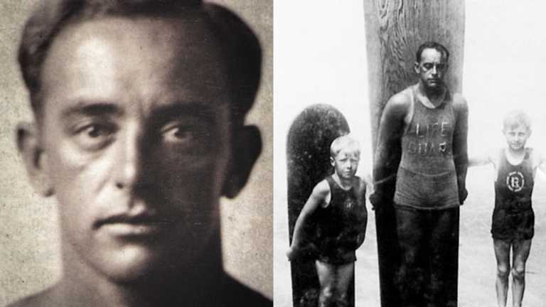 But guess what? You start peeling the cliches off of the George Freeth legend and what emerges is—a sad sack, okay, but a more interesting sad sack than we ever imagined. By the end of my week-long archival swim through Freeth’s life and times (click here) I was buzzing on all the unexpected twists, turns, and quirks. In 1912 alone, he speared a porpoise, bodily flung a peeping Tom into the ocean, and did a bit of cross-dressing undercover work. And how about nasty business in 1909? Am I wrong, or did George Freeth go to court to snitch out his fellow lifeguards, skip town, then return to throw more legal hammers? HBO could mini-series the shit out of that.