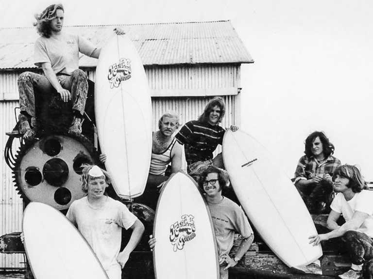 [Photo grid, clockwise from top left: the Fonze; Matt Hoy by Bosko; Buttons and Liddell by Steve Wilkings; Roddy Doyle; 1970 twin-fin; Al Pacino in Scarface. Matt Hoy and Colm Meaney. Buttons, Chris Carter, Mark Liddell. The Heritage Surfboards crew, 1971. Peter Townend at the Coke party.]
