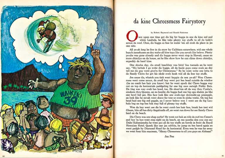 We begin with the canonical reading of “Da Kine Chreesmess Fairystory,” by the Patterson brothers. “Once upon one time get dis big fat bugga in one da kine red and white Lauhala, he like take plenty toy stuffs to all da keikis aroun da worl. Chee, dis bugga so fass he make ’em all ovah da place in jes one nite.” Read the whole thing, in all its 1966 pidgin-English glory, here.