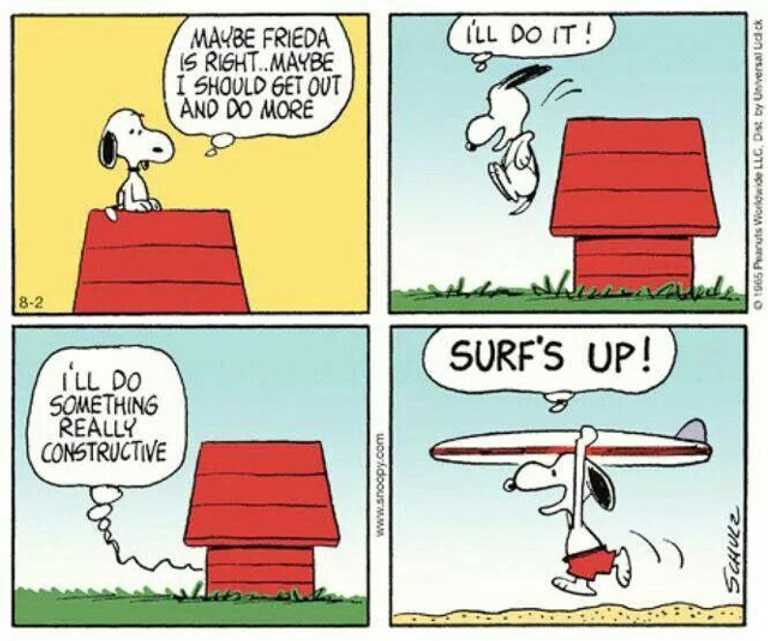 But let us return to cheer, leaving Charlie Brown for Snoopy, and here’s hoping that at some point this week you’re running out of the house with an all-caps “SURF’S UP!” thought bubble over your head.